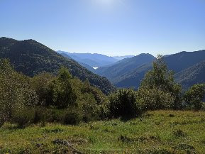 Gli Scozzesi avevano buon naso. Teniamo la destra, attraversiamo le baite, saliamo nel bosco ed arriviamo ad una strada che seguiamo per qualche decina di metri. Riprendiamo il sentiero sulla destra e passiamo lungo una caratteristica scala con gradini in legno. Siamo all’Alpe Vanzone, 1172, “il balcone sulla valle”, come recita un cartello di legno appoggiato a terra (un’ora da Gurro). Rientriamo nel bosco, tenendoci a sinistra sempre sulla dorsale, ed arriviamo ad una radura con panorama su un piccolo triangolo di Lago Maggiore. Ci inerpichiamo sulla nostra destra, sbagliando con l’aiuto dell’anziana guida odierna, soggetta a cali di memoria, e perdiamo solo un quarto d’ora per tornare in ordine sparso sulla retta via, anche grazie all’ottima copertura telefonica. Negli anni ottanta come facevamo?