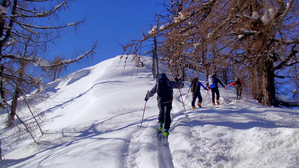 Per i ciaspolatori si tratta di ordinaria amministrazione e si godono tranquillamente, senza aver pagato il biglietto, lo spettacolo pirotecnico della gara di tuffi nella neve offerto dai poveri sciatori. Di solito con gli sci si torna a valle molto prima, ma oggi si arriva quasi insieme e le gambe degli sciatori tremano molto di più di quelle dei saggi con le ciaspole.