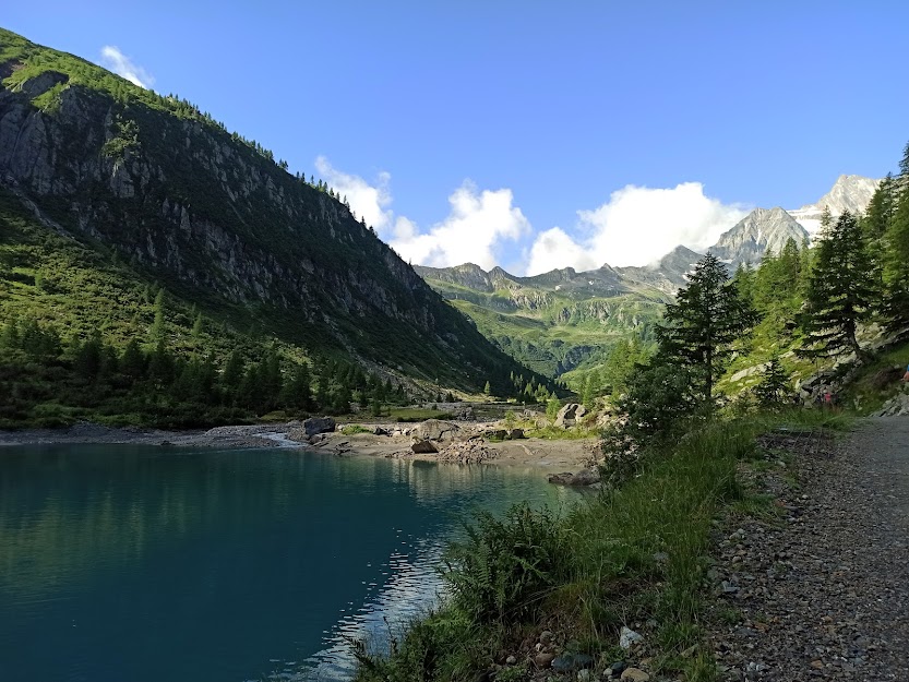 Da Gondo saliamo nella Valle di Zwischbergen, a Bord, poco oltre il bacino di Sera. Parcheggiamo nel solito grande spiazzo sulla riva del torrente Grosses Wasser, a quota 1300 circa. Pensando agli oltre quaranta gradi del nostro Sud, ci gustiamo i dieci gradi di questa valle ancora in ombra. Ci dirigiamo a meridione in dolcissima salita sulla strada asfaltata fino al fabbricato di una centrale idroelettrica. Sullo sterrato arriviamo a Tannuwald, 1420, e attraversiamo il torrente, passando sulla destra orografica con la sua bella mulattiera. Siamo sui sentieri TPA (Tour del Pizzo Andolla). La strada sterrata resta sulla sinistra orografica. Prima del bacino idroelettrico di Fah, 1761, riattraversiamo il torrente e, lungo la strada, oltrepassiamo il lago.