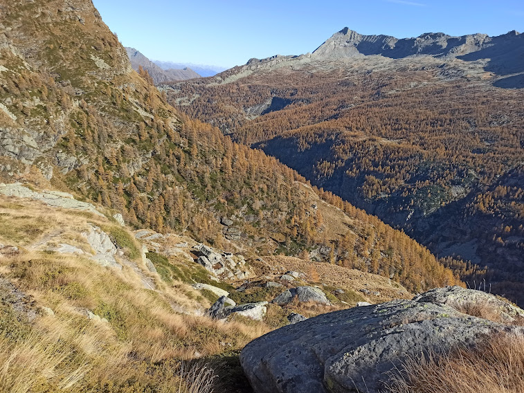 Ci ricompattiamo ed iniziamo la salita “seria”, diretti adesso a nord ovest, incontrando, poco più in alto, il caldo sole di questa magnifica giornata autunnale. Siamo immersi nel colore dorato di vecchi larici che il poeta della montagna Paolo Crosa Lenz chiama “signori dell’autunno”.
