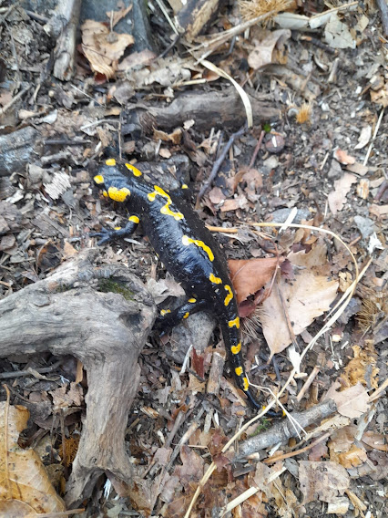 Ma alla nostra guida piacciono le varianti delle varianti e così, fra il bivio e il tratto con ringhiere, ci conduce a destra lungo un sentierino che ha pulito e che ci riporta, più in alto, sul sentiero Arlo. Teniamo la sinistra e lo seguiamo fin quasi a Pregliasca, incontrando nella piccola gola del Rio Gaggio una salamandra che, stranamente, predilige il clima secco.
