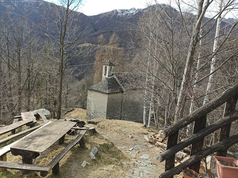Poco prima di Pregliasca ci concediamo la terza variante per movimentare un po’ quello che, altrimenti, sarebbe il semplice e breve tragitto da Cisore a Monteossolano. Saliamo a destra sul terzo vecchio sentiero che ha riscoperto e saliamo di poco sopra quota 1000 fino ad una piccola baita in prossimità di un ruscello asciutto. Appena sotto c’è un’altra baita, nel bosco. Un altro sentiero scende da qui a Monteossolano, 784, passando più in alto del grande parcheggio e attraversando la valletta del Rio del Croppo. Camminiamo da due ore ed abbiamo raddoppiato sia il tempo che il dislivello. Il Circolo questa mattina è chiuso e proseguiamo verso l’Oratorio di San Rocco, 730.