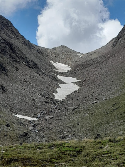 Ci aiutano un paio di nevai sui quali si cammina decisamente meglio. Gli amici e la saggia guida si adattano pazientemente al mio passo da “vaca vegia”, come direbbe l’ex alpinista acciaccato, oggi assente. Pago a caro prezzo gli ozi della vacanza al mare. Il gruppo in mia assenza si è fatto due giterelle da quasi 1500 metri di dislivello e la differenza di prestazioni, che già prima era evidente, si è ulteriormente accentuata.