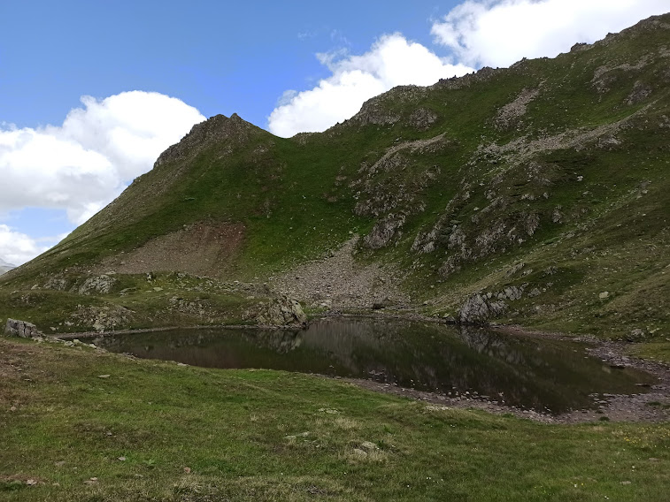 Ridiscendiamo a quota 2400, in zona riparata e in uno splendido verde, per la pausa pranzo. Le nuvole sono sempre più minacciose. Non seguiamo il percorso di salita, ma puntiamo decisamente a nord, lungo una traccia che ci mantiene alti rispetto al vallone di Nefelgiù alla nostra sinistra (occidente).