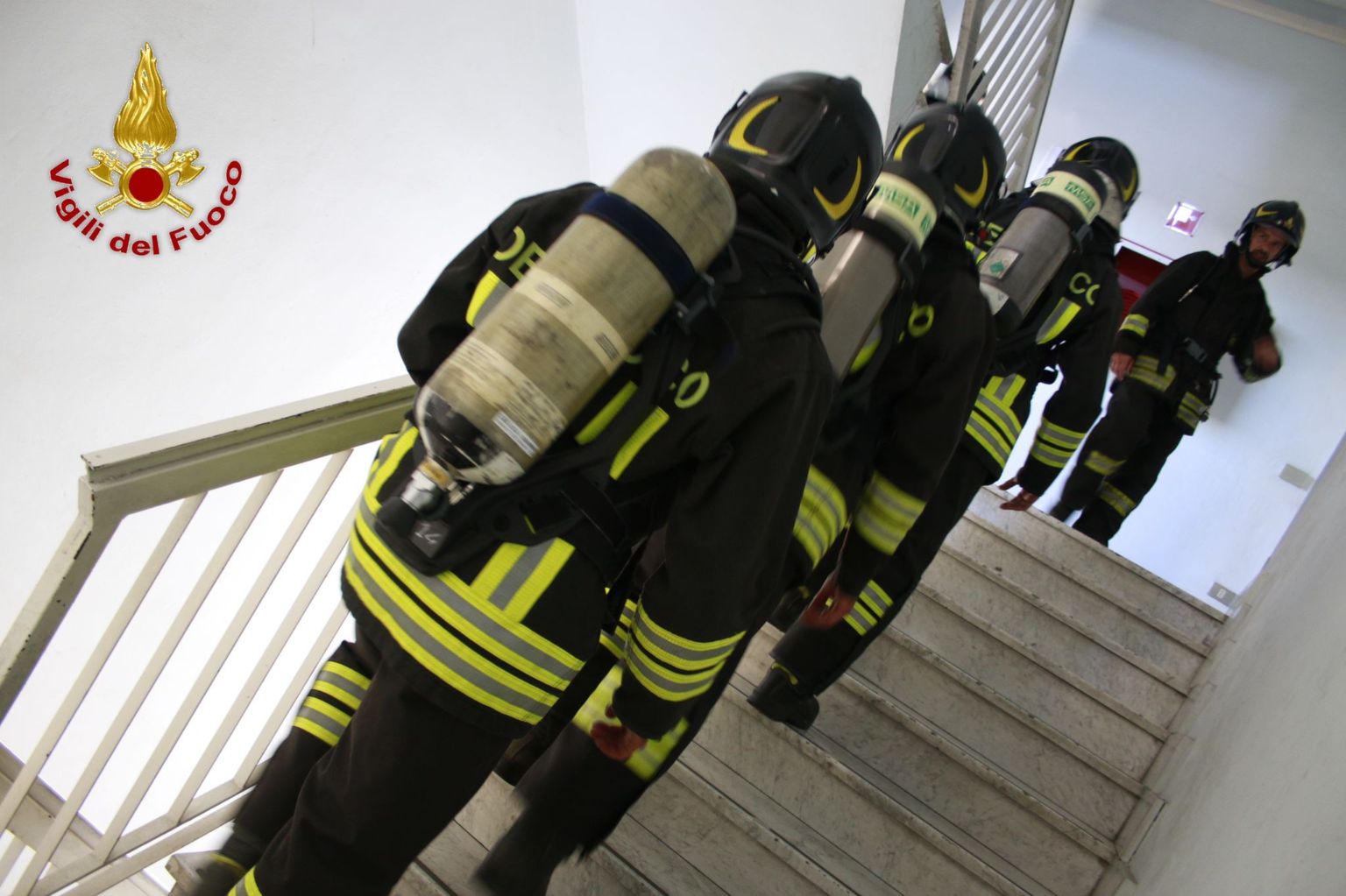 In seguito, una rappresentanza del personale, ha eseguito la salita del castello di manovra, alto 4 piani, per 27 volte, in modo da riprodurre la salita dei 110 piani delle torri gemelle, il tutto con vestizione completa da incendio.