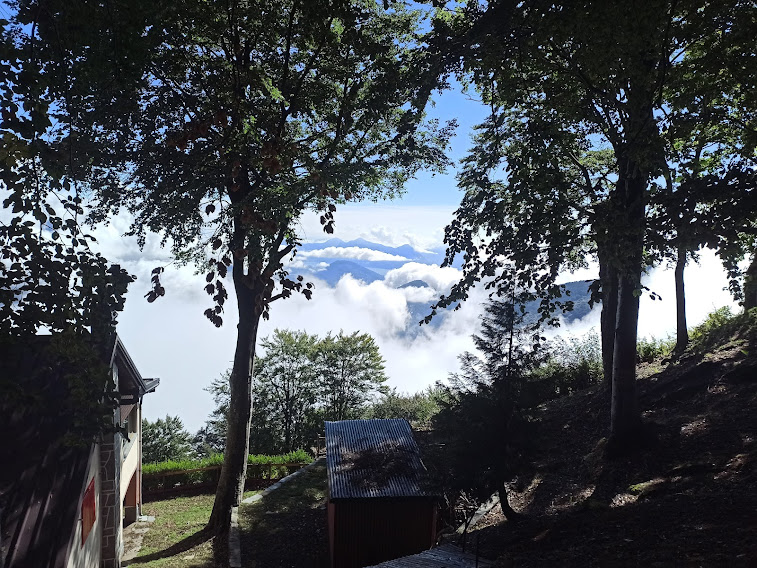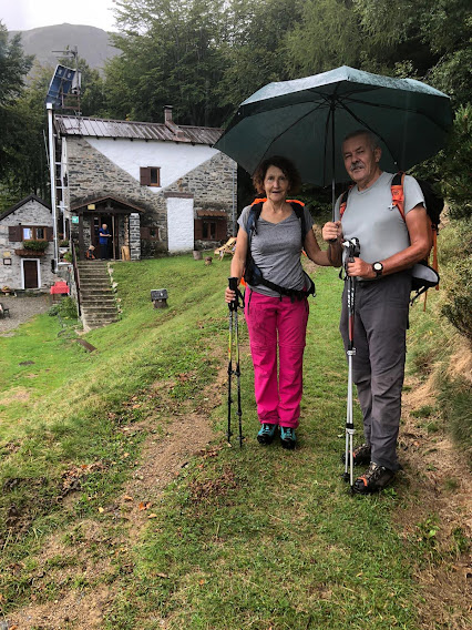 Altra inversione di rotta, diretti sempre a Cortevecchio, su pista e su bel sentiero. Di qui si va anche alla Cappella del Buon Pastore, 1555, dove arriviamo dopo un’ora e un quarto, distratti e rallentati da qualche porcino. Seguendo prima il sentiero, poi la strada che scende da Rossombolmo e nuovamente il sentiero raggiungiamo Cortevecchio e il Rifugio Brusa Perona, 1535, in venti minuti, con la pioggia che torna a farci compagnia. Mangiamo bene e in abbondanza.