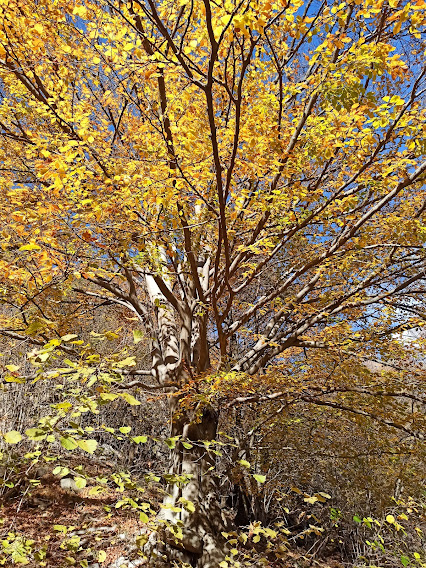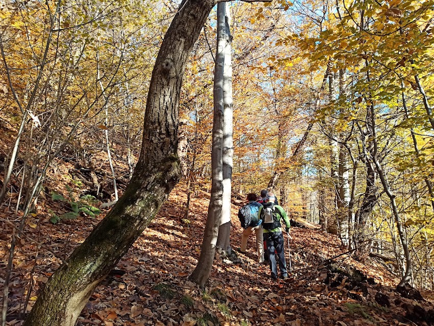 Parcheggiamo all’ingresso del paese, quota 729, e passiamo vicino al piccolo cimitero per andare a imboccare il sentiero R09 che entra subito nel bosco. Per tutta l’escursione cammineremo con attenzione, su terreno scivoloso e ricoperto di foglie, a volte impervio ed esposto. Ce la prendiamo inizialmente con calma, con pause di vario genere.