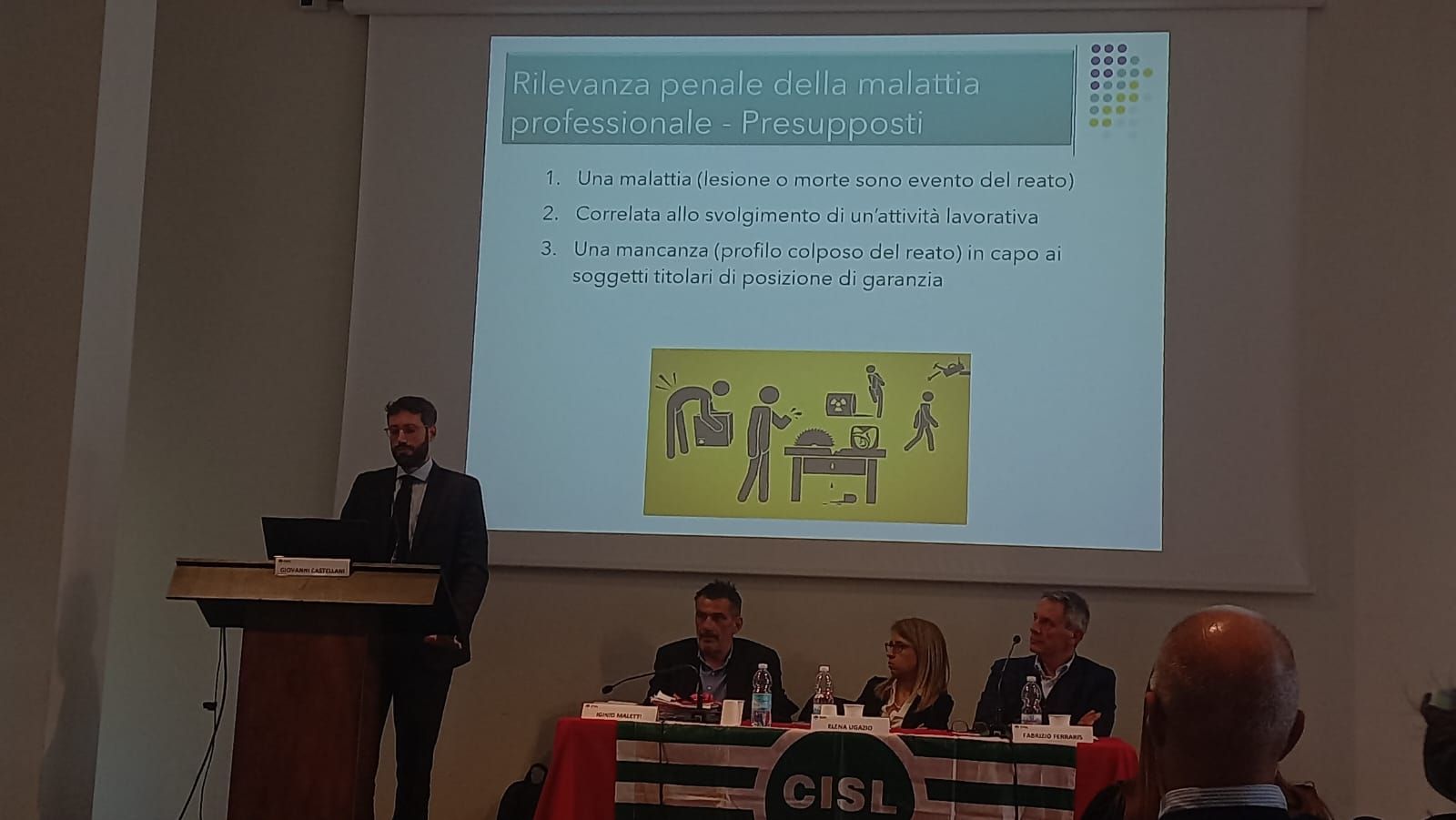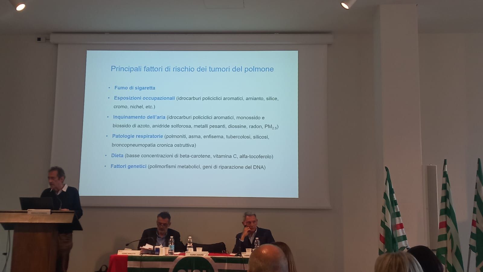 Sono così seguiti gli interventi come da programma: Fabrizio Ferraris di Cisl P.O. che ha messo in luce quanto i dati Inail siano sottostimati rispetto al numero delle reali malattie; Enrico Bergamaschi, professore di Medicina del lavoro alla Città della Salute e della Scienza Torino che ha messo in evidenza il ruolo fondamentale del medico del lavoro e del medico di medicina generale; Carla Corsi, dirigente medico dell’Inail di Novara che ha spiegato un po’ come funziona la sua struttura; Angelo D’Errico, epidemiologo dell’Asl TO 3 che ha fatto un focus sul tumore dei polmoni, il primo causa di morte tra gli uomini; Roberta Grossi, dirigente medico dello Spresal dell’Asl NO che dopo aver dato un inquadramento del suo servizio mettendo in evidenza il continuo calo di personale (è l’unico medico rimasto), ha sottolineato il ruolo fondamentale della prevenzione nei luoghi di lavoro; infine Giovanni Castellani, sostituto procuratore della Repubblica di Novara che ha illustrato il ruolo delle Procure nei casi elencati precedentemente, poiché l’incontro era anche accreditato per l’ordine degli avvocati.