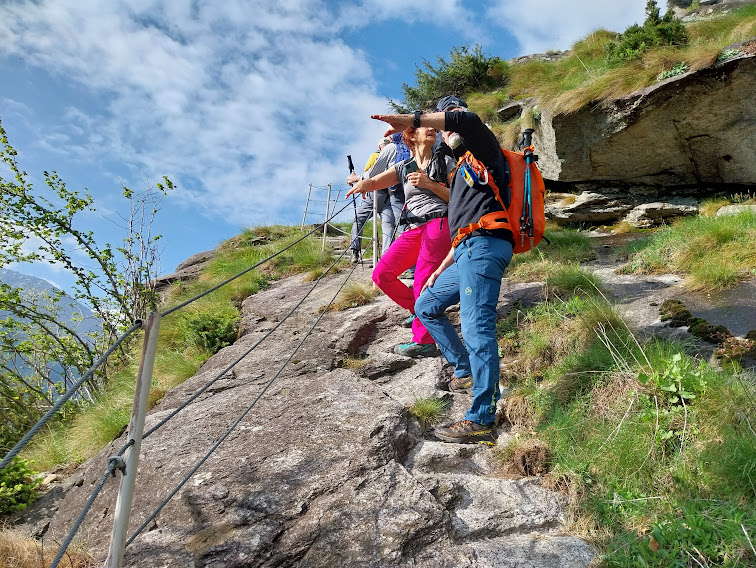 La nostra fede non vacilla e cominciamo a salire in presa diretta, quando termina la pista al disopra un muro ciclopico di enormi blocchi. Un tratto di mulattiera e poi sentiero, più in alto ben attrezzato con gradini scavati nel granito, ringhiere, scalette di ferro. Il tutto a picco sullo strapiombo, ma in tranquilla e totale sicurezza, con bellissimi panorami su Antigorio e Ossola. Sopra il precipizio entriamo in un ripido bosco di faggi ed il tragitto ad alto rendimento ci porta al Bacino (che è nel cuore della montagna) a quota 1200.