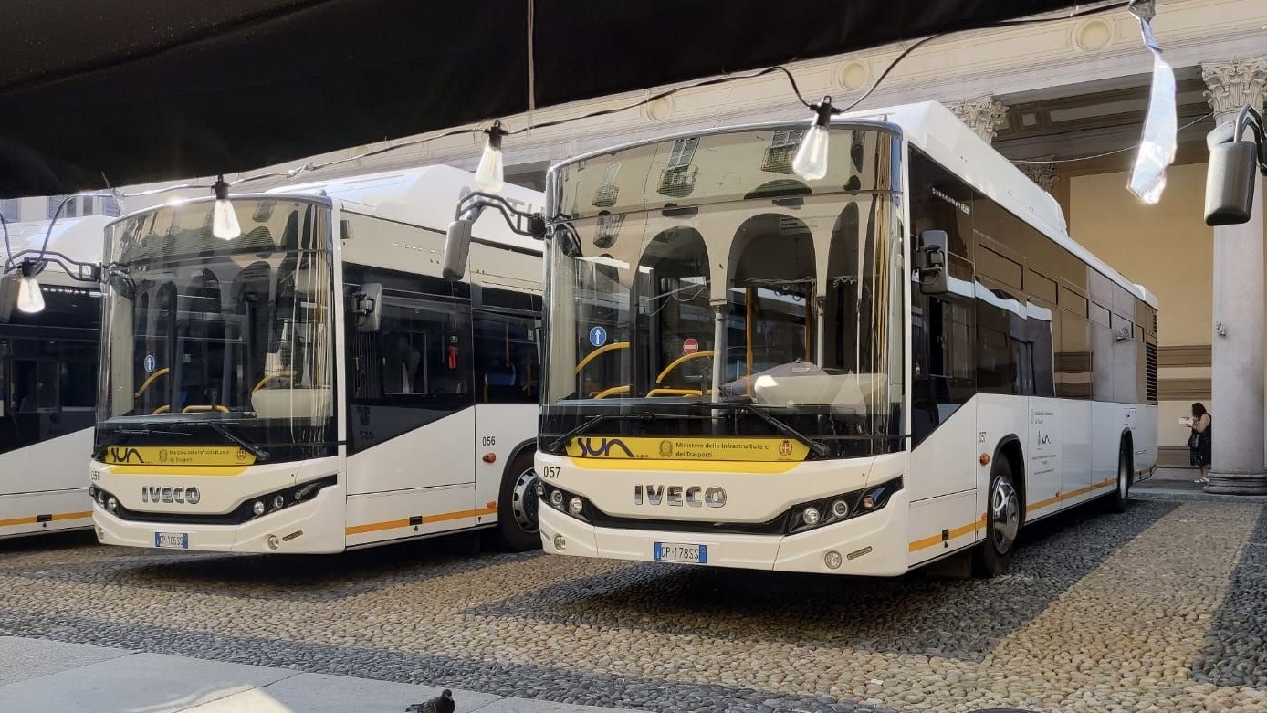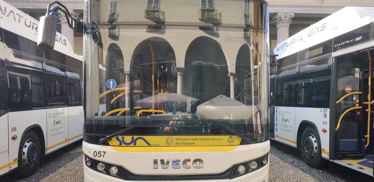 NOVARA - 10-09-2023 -- Sono stati presentati domenica mattina, 10 settembre in piazza Duomo a Novara, 15 nuovi autobus a metano di ultima generazione per un traffico urbano sostenibile.