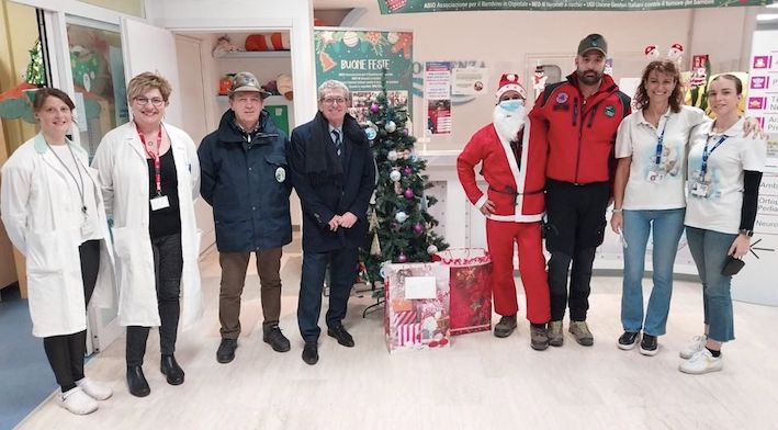 NOVARA - 20-12-2023 -- Babbo Natale arriva dal cielo per i bambini della Pediatria (diretta dalla prof.ssa Ivana Rabbone) dell’Azienda ospedaliero-universitaria di Novara. Anzi, i… Babbi Natale sono stati addirittura nove.