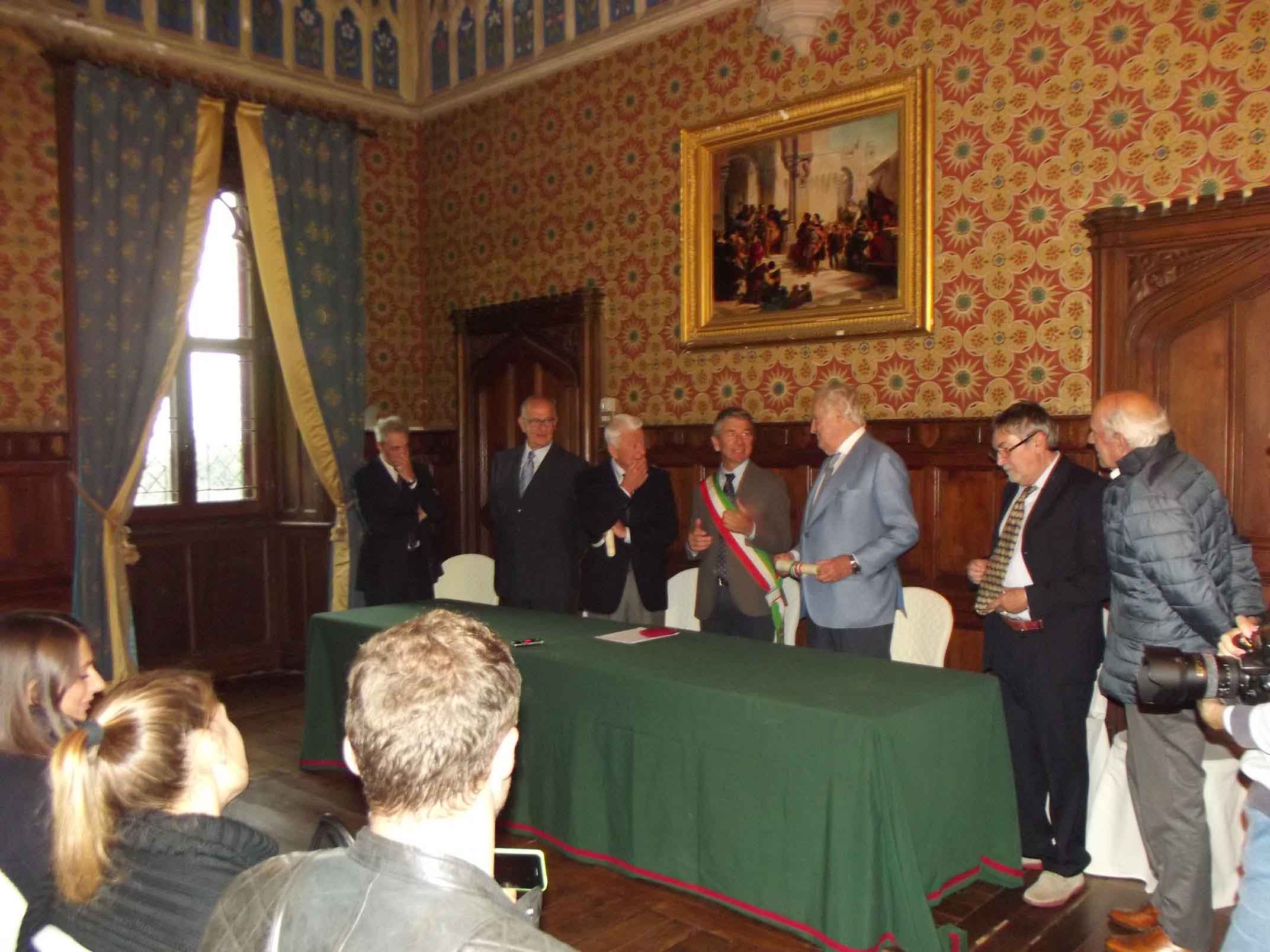 OLEGGIO CASTELLO-11-10-2016- Oleggio Castello ha due nuovi cittadini onorari. Roberto Romerio Bonazzi, storico farmacista del paese e l’industriale Giuseppe Miglio che sponsorizza borse di studio per gli studenti delle scuole sono stati insigniti della cittadinanza domenica pomeriggio nella location del castello Dal Pozzo. Renzo Norbiato sindaco ha spiegato le motivazioni:. “ Cavaliere Del Lavoro Dott. Giuseppe Miglio: “Per l’attenzione dimostrata alla nostra comunità e in particolare ai più giovani. Attenzione che si è manifestata nella volontà di trasmettere alle generazioni future il sapere, attraverso il supporto diretto e indiretto agli studenti Oleggesi”. Dott. Roberto Romerio Bonazzi: “Per il suo esempio di vita ispirata ai fondamentali valori umani della solidarietà e dell'aiuto al prossimo, per l’esemplare impegno, per il costante interessamento e la disponibilità dimostrata verso la comunità degli Oleggesi”. Ci sono poi state le testimonianze di due Oleggesi, il Dotttor Narciso Brunoni e il Dottor Luca Fazio che hanno motivato, sulla base delle loro esperienze, le ragioni della riconoscenza da parte della comunità a Miglio e Romerio .La cerimonia si è conclusa con la consegna simbolica della cittadinanza onoraria, un discordo dei due "nuovi Cittadini" e un brindisi. (MA RO)