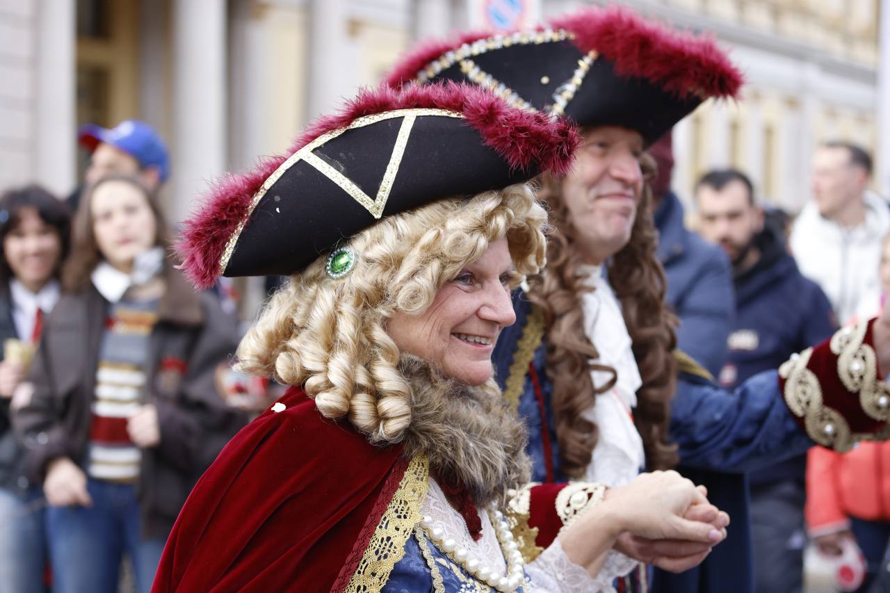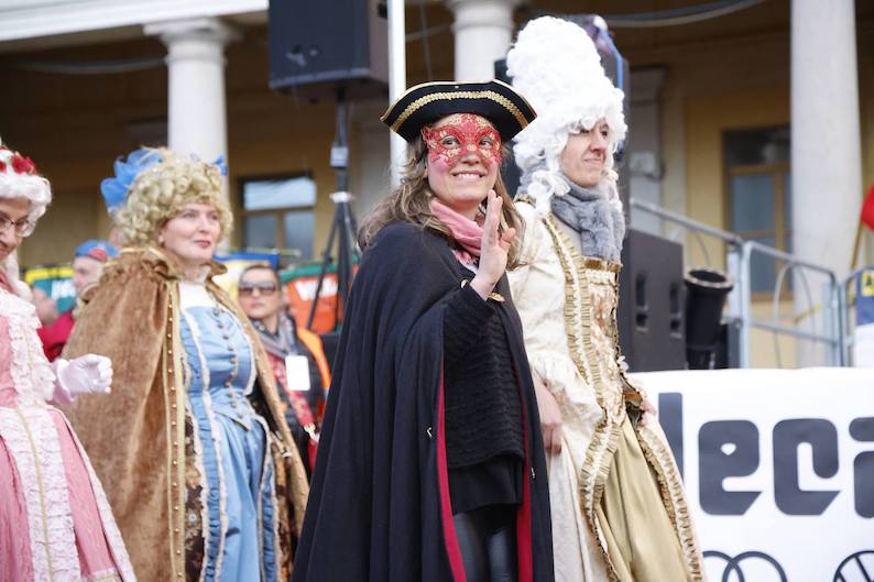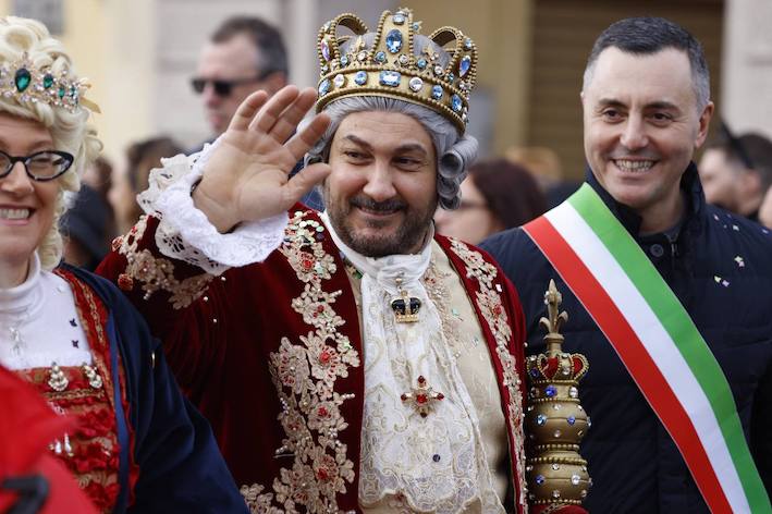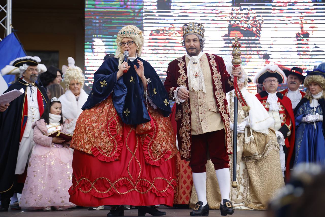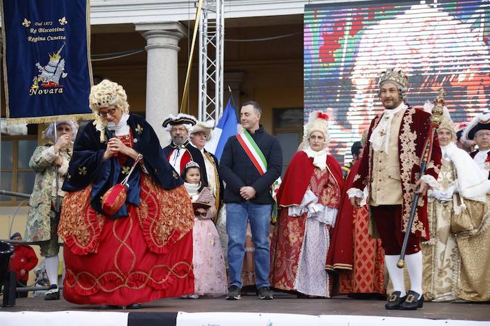Il lungo corteo mascherato si è aperto con in testa i "reali" novaresi, Re Biscottino e la Regina Cunetta.
