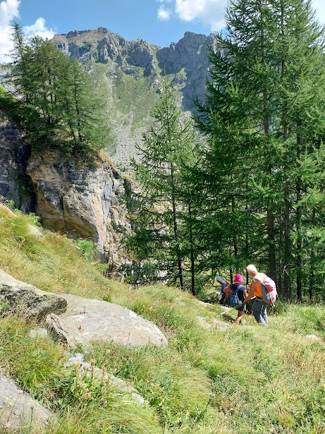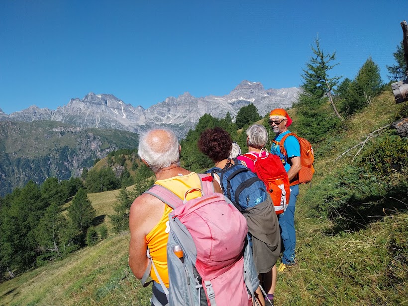 Un altro giovedì in Paradiso, nonostante i nostri peccati. A Corte Verde una freccia rossa su un sasso e la scritta “Nava” ci ingannano. Teniamo la destra seguendo un sentierino che, più in alto, si perde in uno splendido e ripido bosco di larici. Dopo rapide consultazioni prevale la saggezza della nostra età media elevata (escluse naturalmente le badanti) e torniamo a Corte Verde. Abbiamo perso quasi un’ora, ma in questa meravigliosa giornata va bene anche un approfondimento delle nostre conoscenze di un territorio nuovo e di grande bellezza.