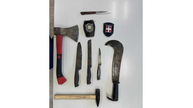 NOVARA -08-04-2025 -- In seguito a controlli propedeutici alla chiusura degli accessi delle caserme Passalacqua e Cavalli da parte del Demanio civile, la Polizia Locale ha sequestrato in un locale interno alla Passalacqua un'ascia, una roncola, un martello e dei coltelli appartenenti ad un occupante abusivo da lui detenuti senza valide motivazioni.