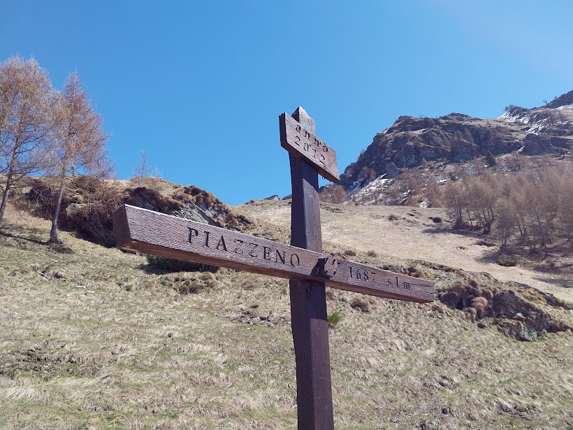 All’Oratorio della Madonna di San Luca, 1156, prima breve pausa, dopo tre quarti d’ora di cammino tranquillo. Sempre sul sentiero proseguiamo fino a Cascine Bertolini, 1318, dove ritroviamo la strada che costeggiamo fino a Coipo, 1385. Qui tagliamo ancora a volte la strada, passando dagli alpeggi di Giovera di Sotto, 1521, di Mezzo, 1556, e di Sopra, 1600 (un’ora e un quarto). Merita qualche minuto la contemplazione del panorama stupendo, in particolare verso il Pizzo Scheggia e le montagne circostanti. Qui il sentiero A04 prosegue sopra le case (“baite” è riduttivo) diretto a nord est (destra). Sulla sinistra, leggermente più in basso, noi prendiamo la pista sterrata che, in morbida salita, porta rapidamente al largo piazzale dove termina. In pochi minuti, su un sentiero che attraversa la ripida valletta del Rio Piccolo, raggiungiamo le baite basse dell’Alpe Piazzeno, 1687.