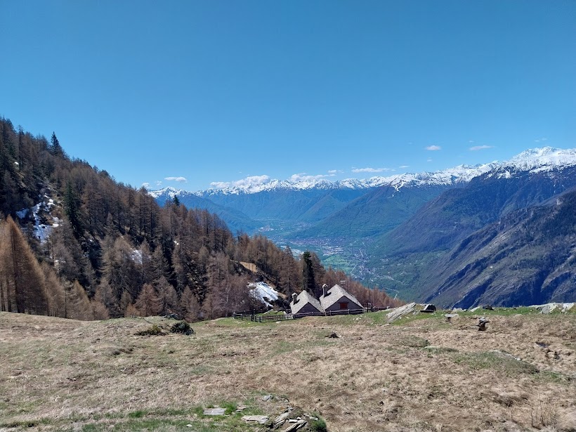 Risaliamo il ripido prato che ci porta alle baite più alte, a quota 1750 circa, ed osserviamo il Monte Larone ancora lontano. E’ difficile rendere l’idea del panorama che si staglia contro l’azzurro del cielo limpido, dal Cistella al Massone passando per il Monte Leone, la Weissmies e il Rosa. Ridiscendiamo alle baite basse e ci sistemiamo per il pranzo, dopo tre quarti d’ora da Giovera di Sopra.