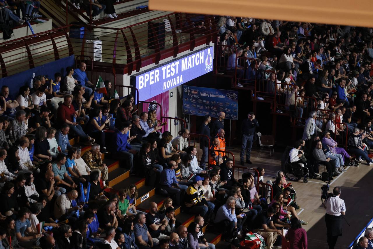 NOVARA - 09-05-2025 --Festa azzurra a Novara, all'esordio stagionale la nazionale femminile di Julio Velasco, impegnata al Pala Igor di Novara nel primo dei due BPER Test Match, ha battuto la Germania 3-1 (25-18, 20-25, 25-17, 25-21). Dopo quasi due ore di gioco Carlotta Cambi e compagne si sono imposte sulla nazionale tedesca allenata dal tecnico italiano Giulio Bregoli. Vittoria meritata per le azzurre, spinte anche dal calore del pubblico che ha potuto così riabbracciare la nazionale azzurra nella prima uscita ufficiale dopo la straordinaria medaglia olimpica ottenuta ai Giochi Olimpici di Parigi 2024. Molto buona la risposta dei tifosi: 2470 gli spettatori presenti al Pala Igor, per un totale di 32.980,00 euro d’incasso.