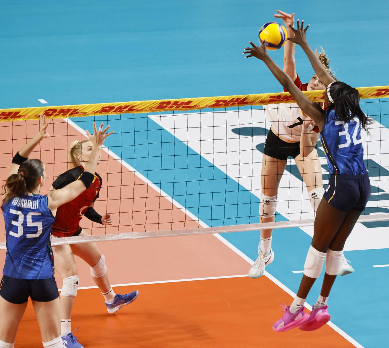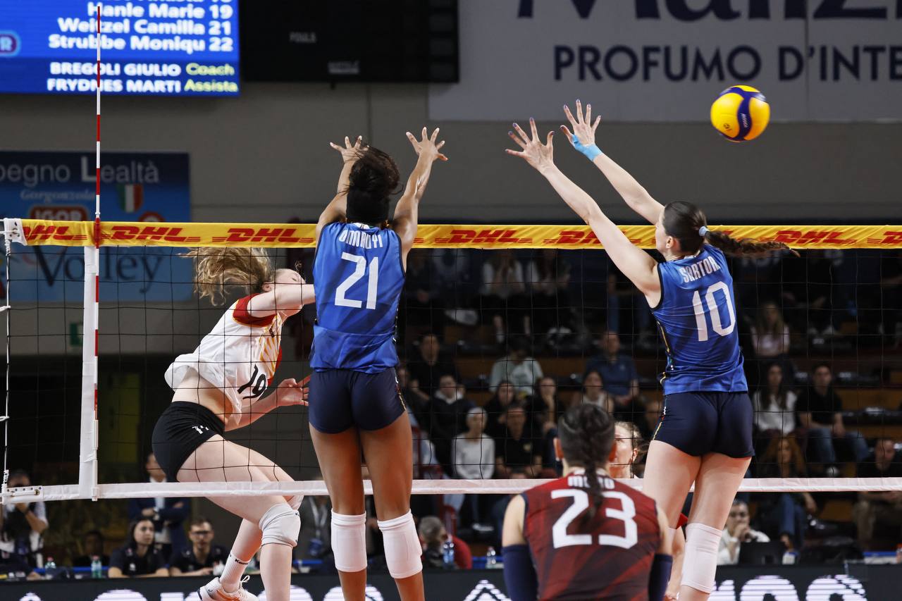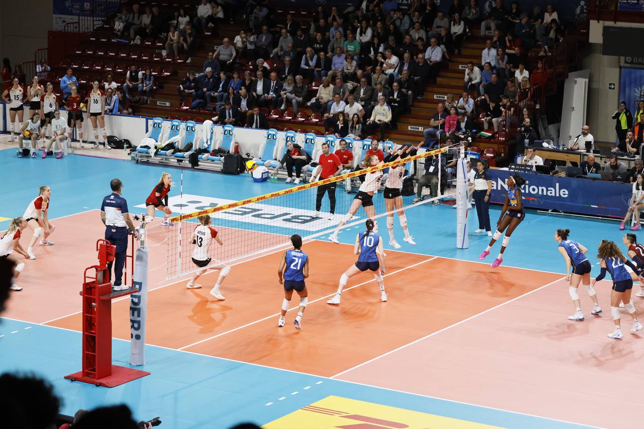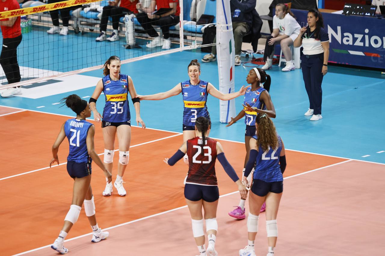 LA CRONACA - Per questa prima uscita stagionale contro la Germania Julio Velasco si affida al sestetto composto dalla diagonale Cambi-Malual, Sartori e Munarini centrali, Giovannini e Omoruyi schiacciatrici e Moro libero. L’Italia parte con il piglio giusto, Giovannini e Sartori per il 2-0 iniziale; muro a due azzurro di Giovannini e Munarini, un ace della stessa schiacciatrice azzurra e l’Italia si porta sul 6-2. Al rientro in campo le tedesche si avvicinano: attacco di Weitzel e la Germania si porta a -2 sul 9-7. Pronto riscatto azzurro: bene al servizio Giovannini, muro di Munarini e attacco vincente di Malual con l’Italia che scappa a +5 sul 15-10. Loveth Omoruyi continua a martellare e spinge l'Italia sul 18-12. Dentro Eze fuori Cambi, primo tempo sull’asse Eze-Munarini per il 24-18 e l’Italia chiude alla prima occasione sul 25-18. Secondo set in salita per l’Italia. Le tedesche partono bene e dopo un momentaneo 2-2 trovano l’allungo: ace di Weske, attacco di Cekulaev e ancora un ace di Tabacucks per il 3-6 Germania. Vantaggio tedesco che l’Italia tenta di ricucire (9-11), ma le tedesche scappano via nuovamente. Doppio cambio per Julio Velasco: Eze per Cambi e Frosini per Malual. Omoruyi tenta di lanciare la risalita, ma il suo attacco viene murato e la Germania si porta a +4 sul 12-16. Tornano in campo Cambi e Malual, ma la Germania non si ferma, continua a macinare gioco e la distanza tra le due compagini cresce (17-21). Camilla Weitzel mette a terra il pallone del 18-23, prima del 20-25 della compagna Cekulaev. Equilibrato l’andamento della terza frazione di gioco. La battaglia sotto rete va avanti e si passa dal 4-4 al 9-9, momento decisivo per l’Italia: Loveth Omouyi trova il punto del 12-9, segunono prima Frosini e poi Munarini 14-11. Ancora due attacchi vincenti di Munarini, poi Giovannini mette a terra la palla del 18-14. La Germania tenta la risalita (18-16), ma sale in cattedra Loveth Omoruyi: la schiacciatrice azzurra mette a segno quattro punti consecutivi, fissando il risultato sul 22-16. Un muro a due azzurro della coppia Sartori/Frosini chiude il parziale sul 25-17. È la formazione di Giulio Bregoli a iniziare meglio il quarto set. La Germania si porta avanti (1-3), per poi trovare il +3 sul 3-6. Pronta reazione delle azzurre che con determinazione ottengono la parità a quota 6. Attacco di Frosini, furbata sotto rete di Cambi e parallela vincente di Frosini, l’Italia scappa sul 10-7. Fasi concitate del match. La Germania non si dà per vinta e tenta di riaccorciare le distanze tornando a -1 (11-10). Cambi e compagne provano l’allungo: Giovannini trova il mani-out tedesco, emulata subito dopo da Frosini per il 15-12. Pausa di gioco chiamata da Bregoli che trova l’effetto sperato: la Germania ritrova infatti la parità sul 17-17. Furbata di seconda di Cambi e attacco di Frosini, con l’Italia che mette il naso avanti (21-20). Finale a tinte tricolori: attacco di Frosini, punto di Giovannini ed è 23-20 Italia. Un errore al servizio della tedesca Marie Hanle regala il match point alle azzurre, occasione prontamente sfruttata dalla neoentrata palleggiatrice Eze che con un ace chiude regala la vittoria alle azzurre 25-21.