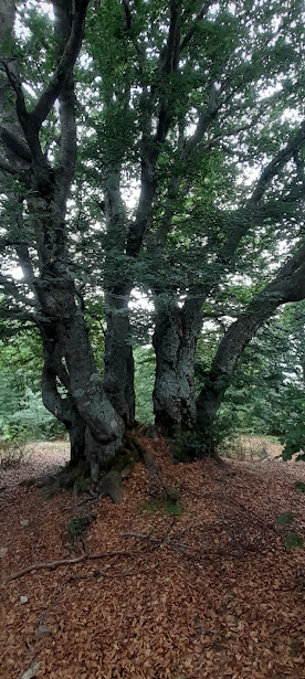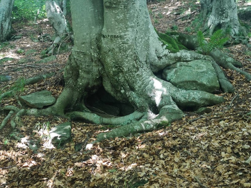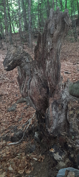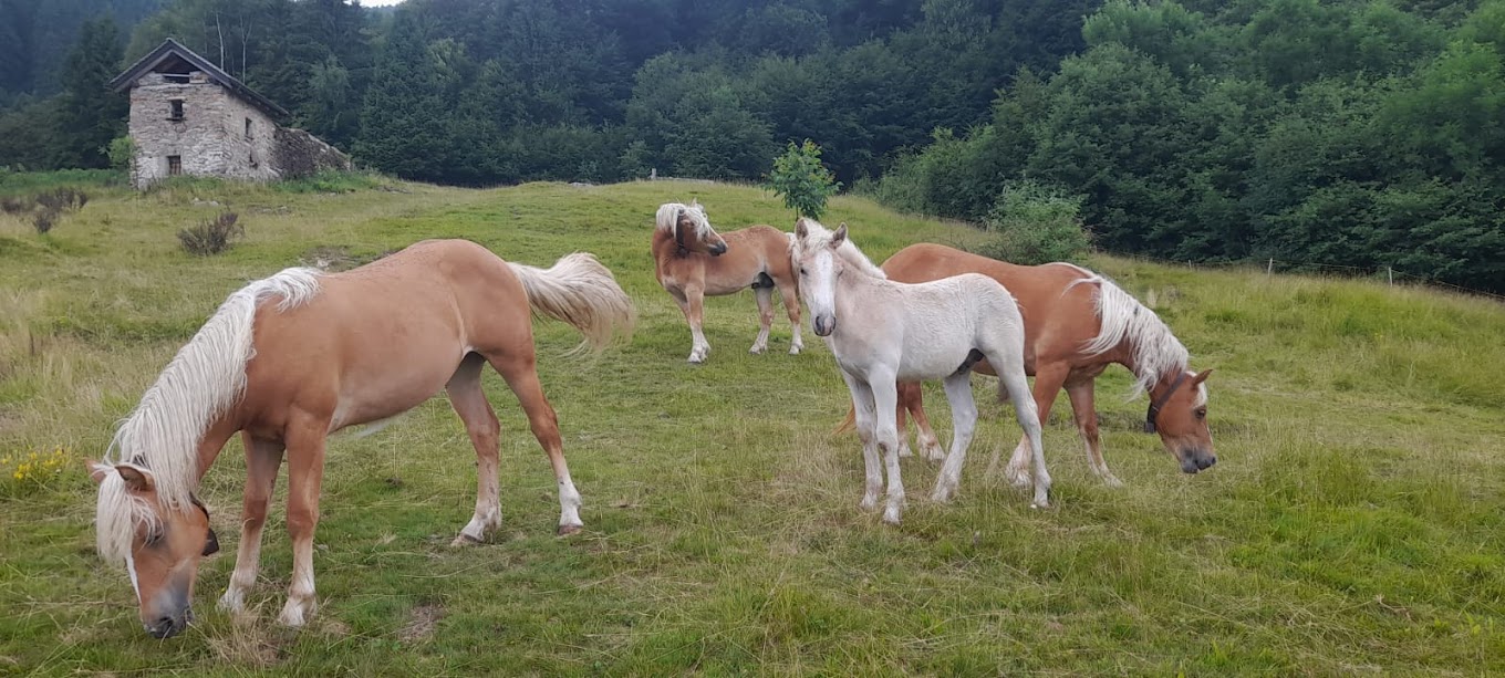 Usciamo dal bosco poco dopo aver osservato un residuo di tronco che assume le sembianze di un drago alato. Ci troviamo nei prati alti di Laurenzo, 1126, vasto e bell’alpeggio a me finora ignoto. Qui ci accolgono dei bei cavalli, ben più ospitali dei cani di Cortino. Invertiamo decisamente la rotta verso nord e poi nord ovest, lungo una comoda pista che permette anche di aprire gli ombrelli all’arrivo di una benefica pioggerella.