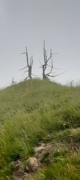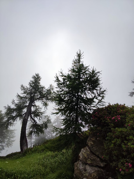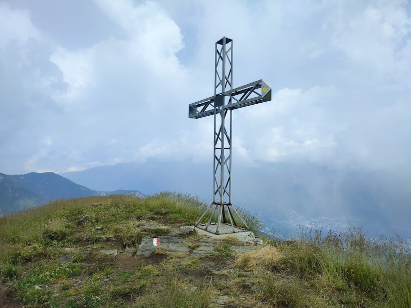 Oltrepassiamo questo luogo meraviglioso e molto panoramico sull’intera valle e, dopo un’ora e tre quarti di cammino effettivo, arriviamo a La Cima, 1810. A nebbie vaganti si alternano ampi sprazzi di sole e le piogge previste non sembrano imminenti. Gli alberi distrutti dai fulmini da queste parti ci fanno apprezzare il ritardo dei temporali previsti.  La badante-guida richiede aiuto al campo base di Malesco, cioè un passaggio in auto da lì a Patqueso per il recupero delle auto, e questo ci consente di improvvisare un giro ad anello aperto, nuovo per quasi tutti.