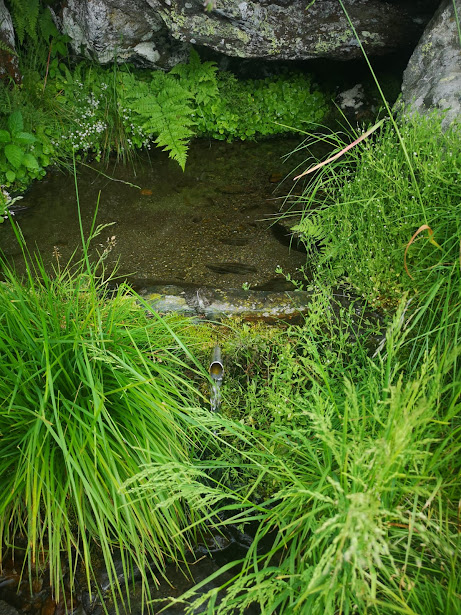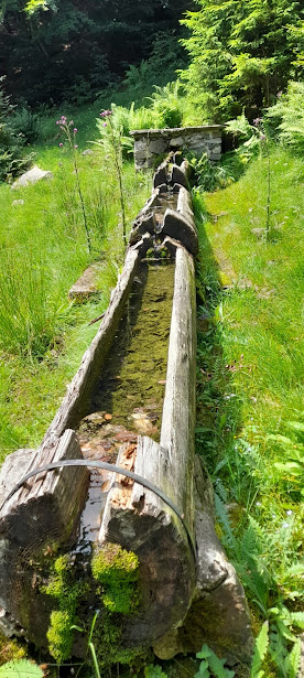 Diretti ad est scendiamo lungo il sentiero S31, verso Finero, fino allo splendido pianoro di Pianzà. Brevissima risalita e percorriamo questa dorsale fra Vigezzo e Cannobina fino alla Cappella del Grop, 1559 (poco meno di mezz’ora). Fino a qui siamo stati su sentieri ben noti a tutti. Dopo un rapido consulto, ispirati dalla badante – guida e da un cacciatore che conosce il territorio, imbocchiamo in direzione nord est il sentiero M16, parallelo, ad oriente, alla Costa Orsera. Pausa pranzo in prossimità di una bella fontana - abbeveratoio di legno a tre stadi.