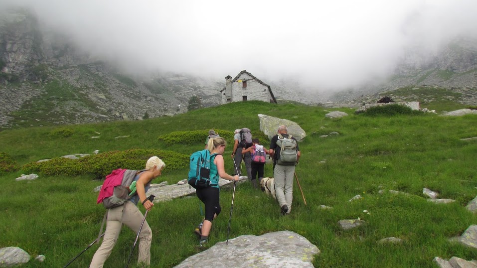 Siamo in undici, con Asia e Nena. Due le signore: un'esperta veterana ed una giovane esordiente. Attraversiamo il ponte e proseguiamo lungo la strada per un breve tratto fino ad imboccare sulla sinistra il ripido sentiero che, in mezz’ora, ci porta all'Alpe Anfirn, 1468. In cima ai prati ci teniamo sulla destra, attraversando il bosco in dolce salita fino al bivio per l'Alpe Forno. Qui il sentiero sale molto ripido e faticosamente raggiungiamo l'alpe, 1877, in poco meno di un’ora. In questo bellissimo “fornale” si trova il Rifugio Regi del CAI Vigezzo. E' chiuso.